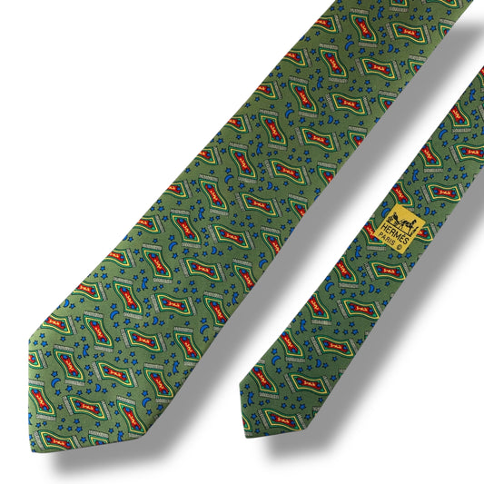 【7299】良品!エルメス ネクタイ グリーン系 カーペット柄