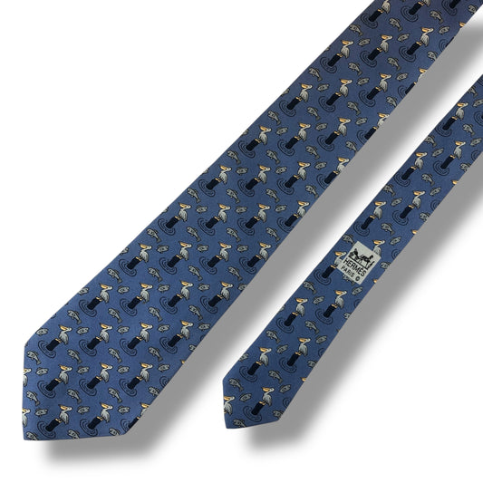 【7312】良品ー可品!エルメス ネクタイ ブルー系 ペリカン柄 魚柄