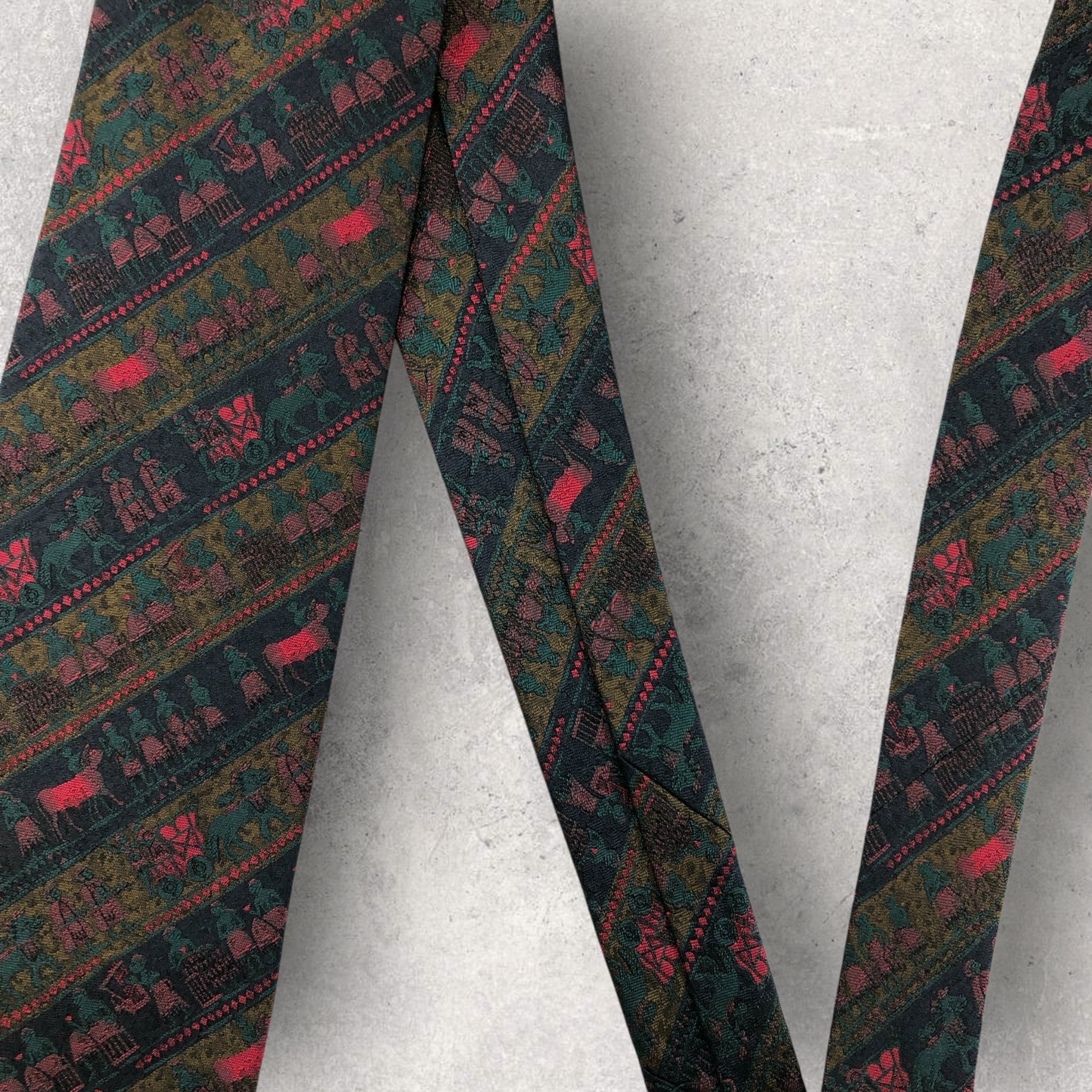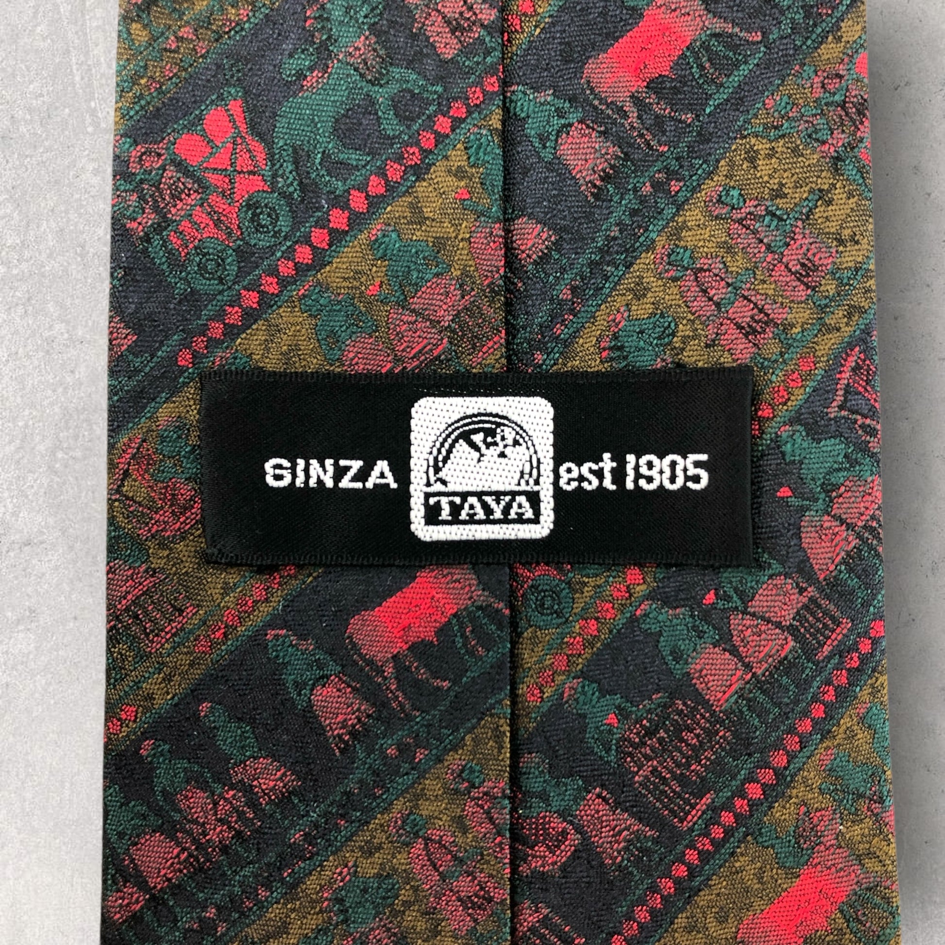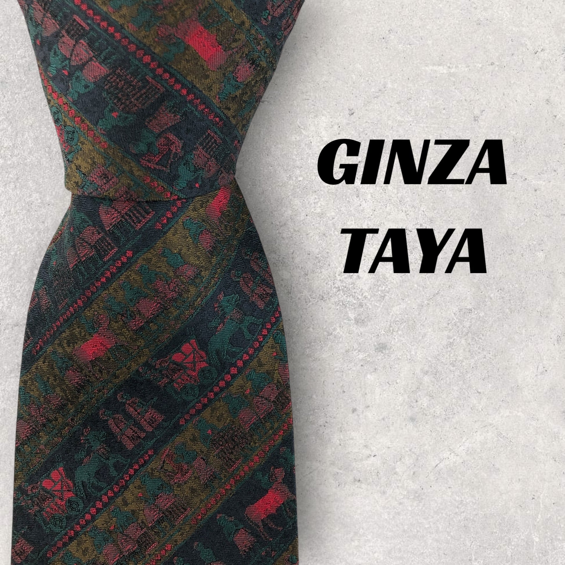 【6859】美品!ギンザタヤ ネクタイ グリーン系 レッド系 壁画柄