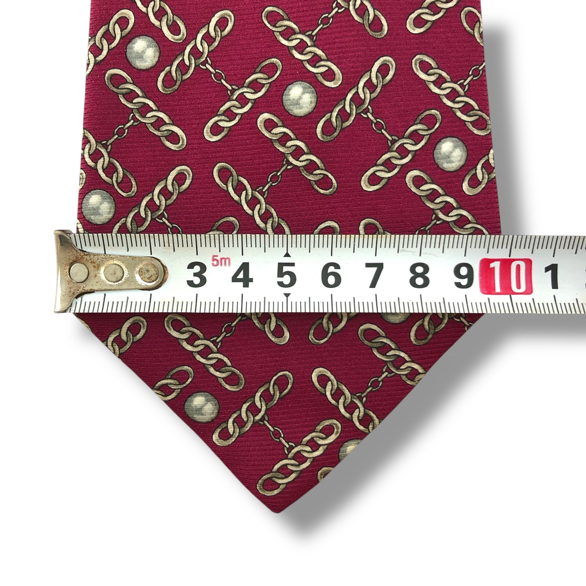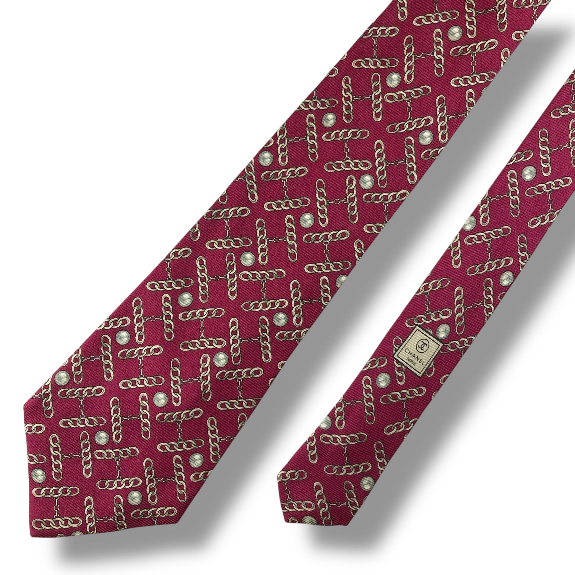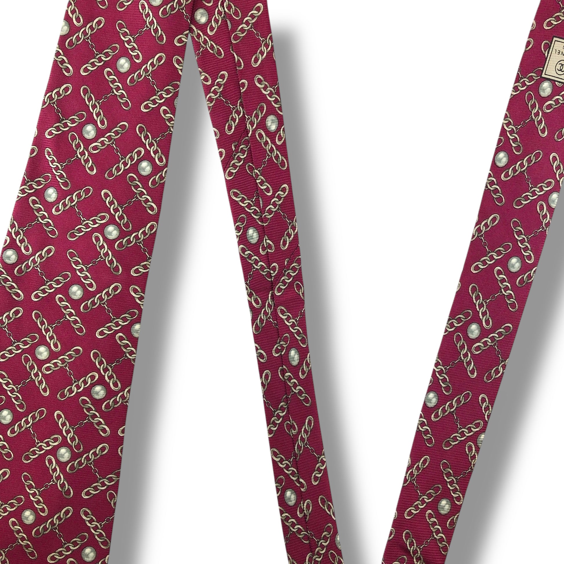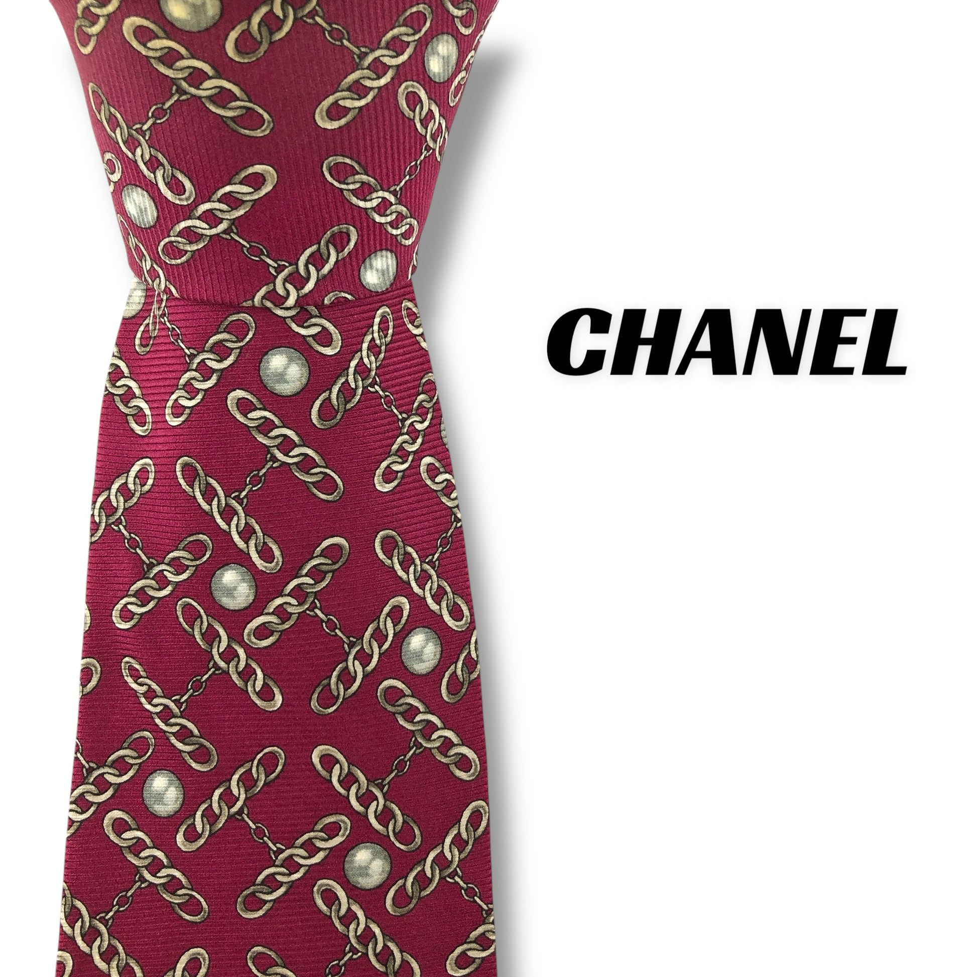 【7672】良品!シャネル ネクタイ レッド系 真珠柄 ゴールドチェーン