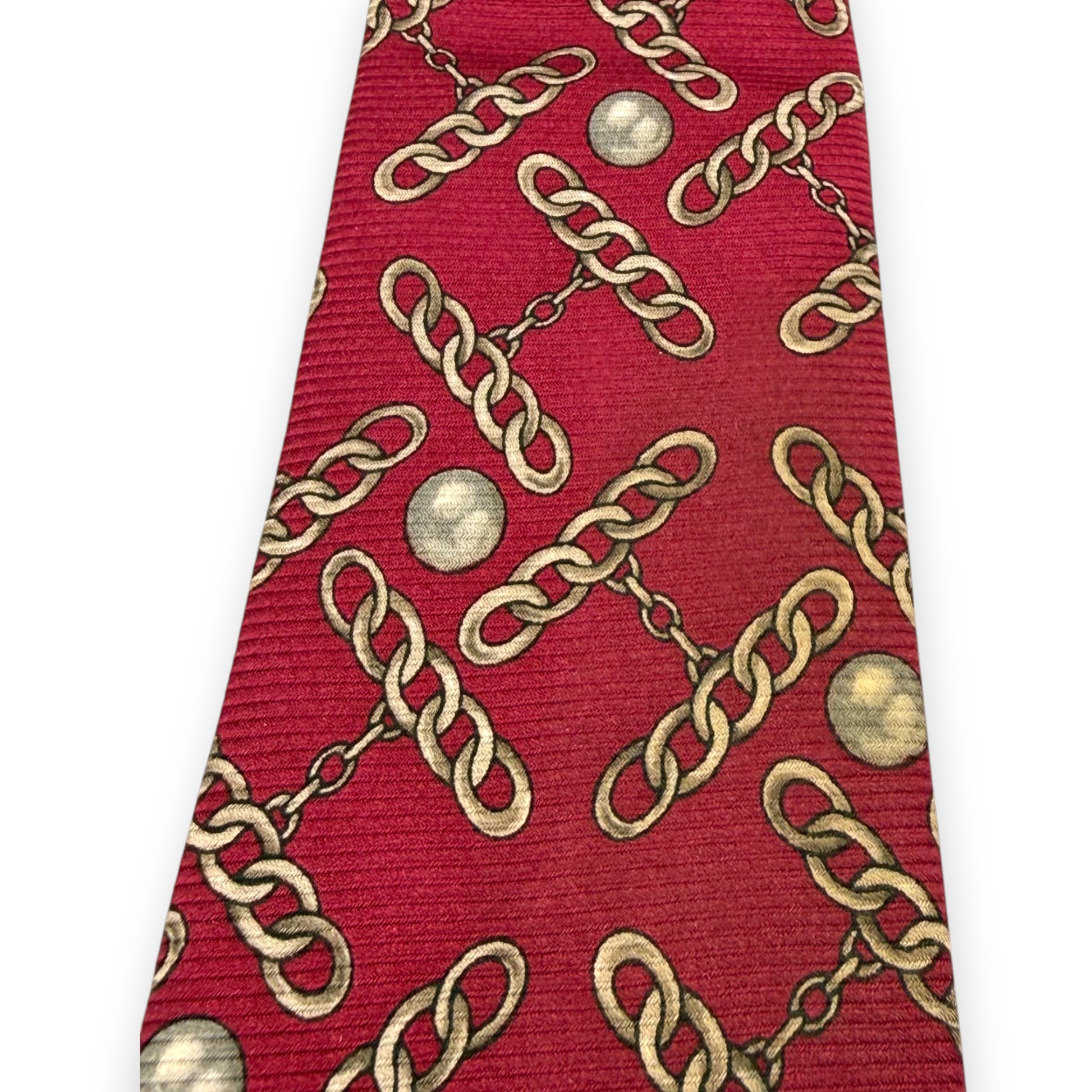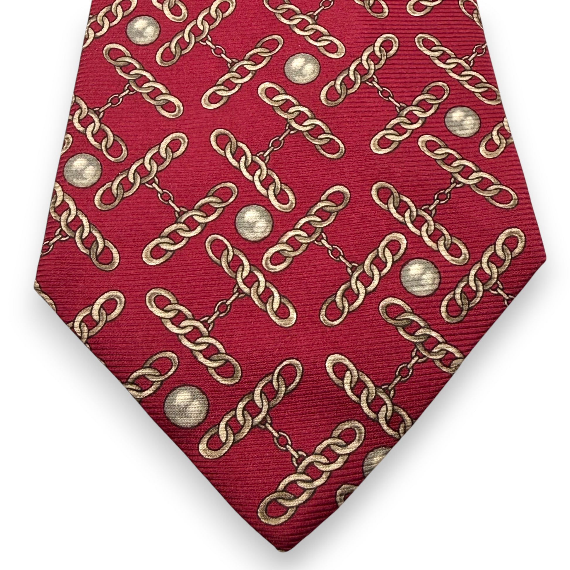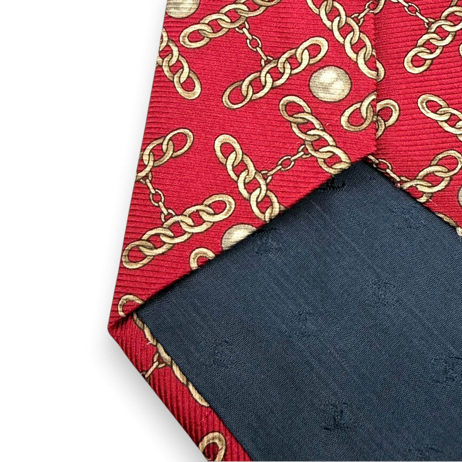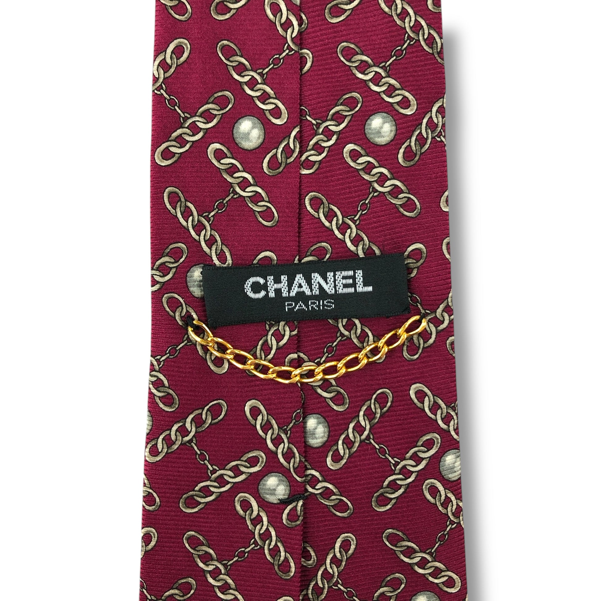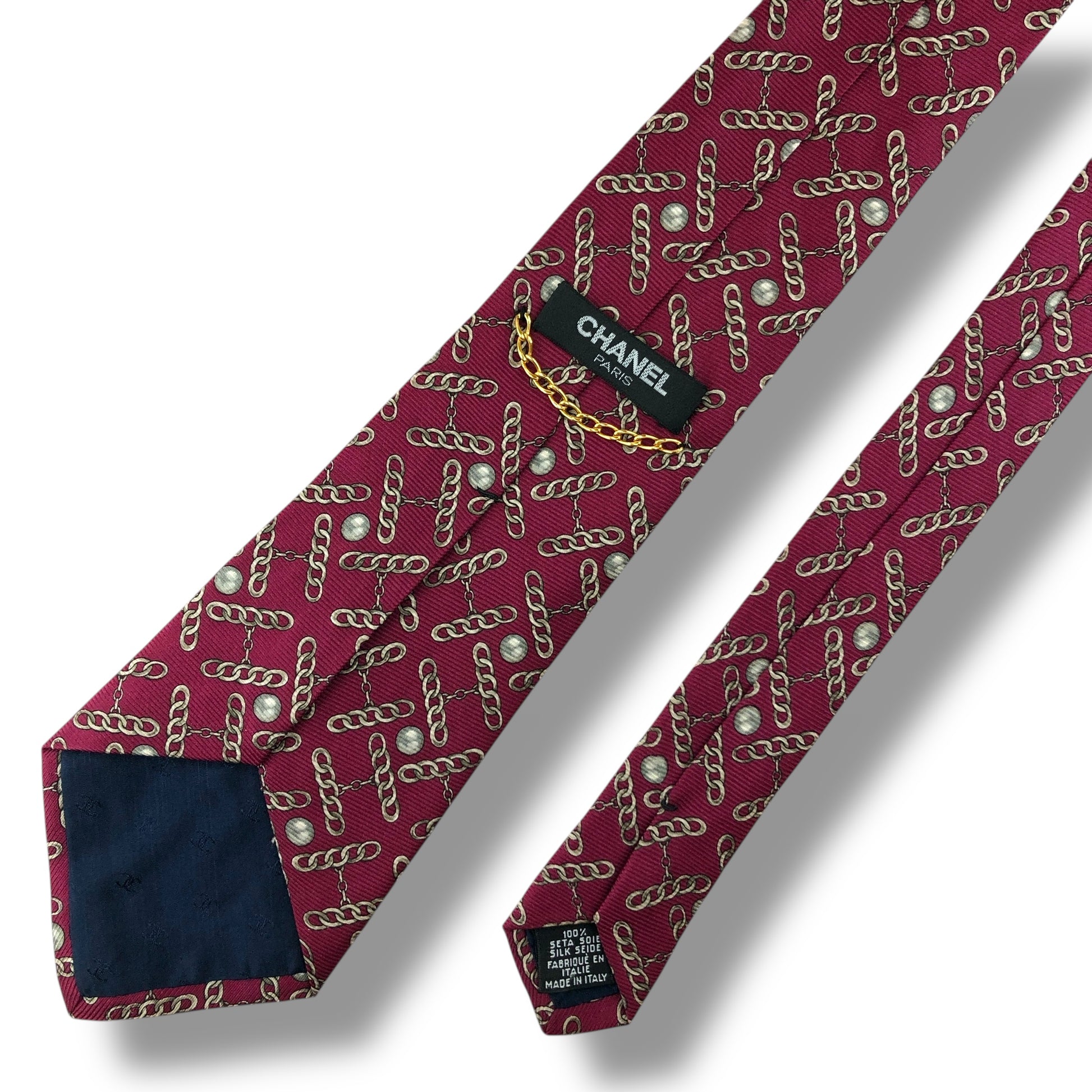 【7672】良品!シャネル ネクタイ レッド系 真珠柄 ゴールドチェーン